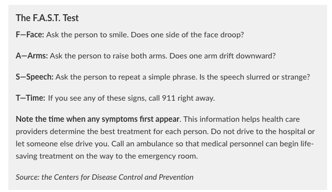 Editor’s Note: If you think someone may be having a stroke, the CDC recommends you quickly perform the F.A.S.T. test and call 911 immediately.