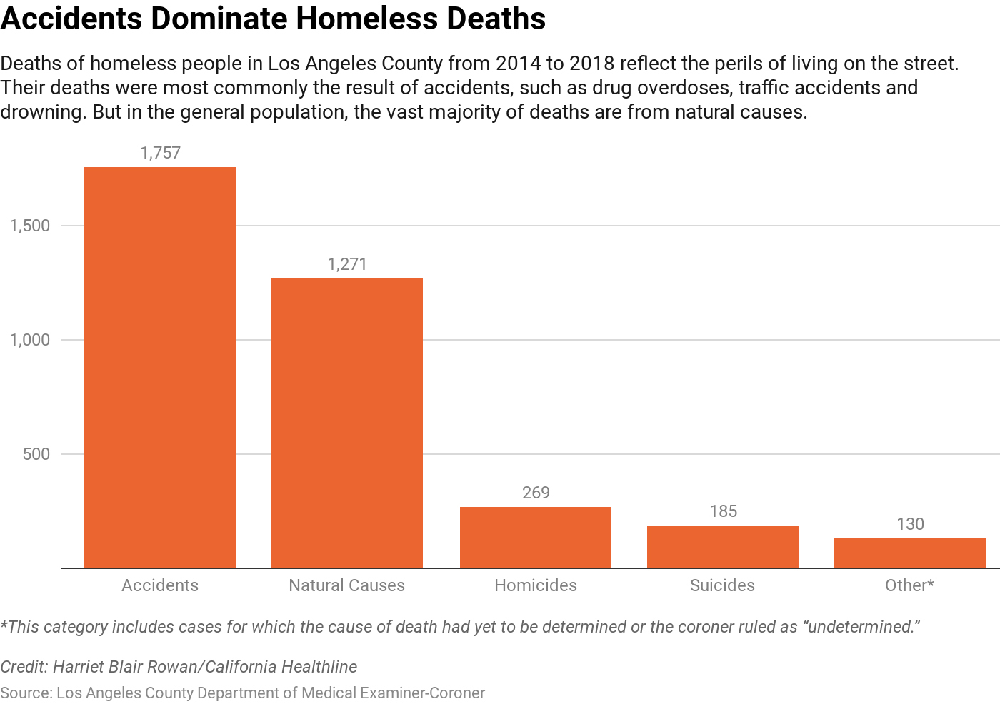 The Los Angeles County Department of Medical Examiner-Coroner considers someone homeless if that person doesn’t have an established residence, or if the body was found in an encampment, shelter or other location that suggests homelessness.