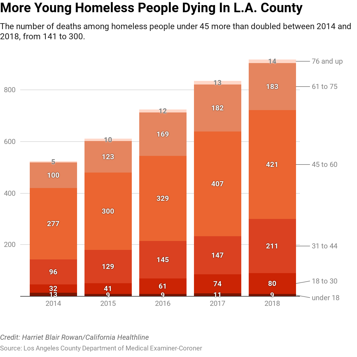 Over the five-year period in L.A. County, there also was a sharp increase in deaths of younger adults who were homeless. For instance, the deaths of adults under 45 more than doubled.