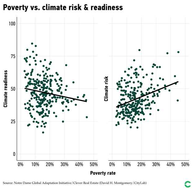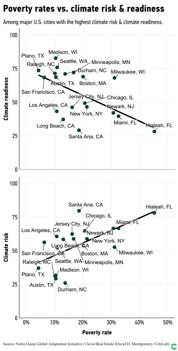 When examining the 20 cities Clever spotlighted by income, those with higher rates of poverty rank lowest in readiness and highest for risks. The top five low-readiness/high-risk cities have large black and Latino populations, while the five cities at the top of the rankings for climate readiness that rank lower on risk have larger white populations.
