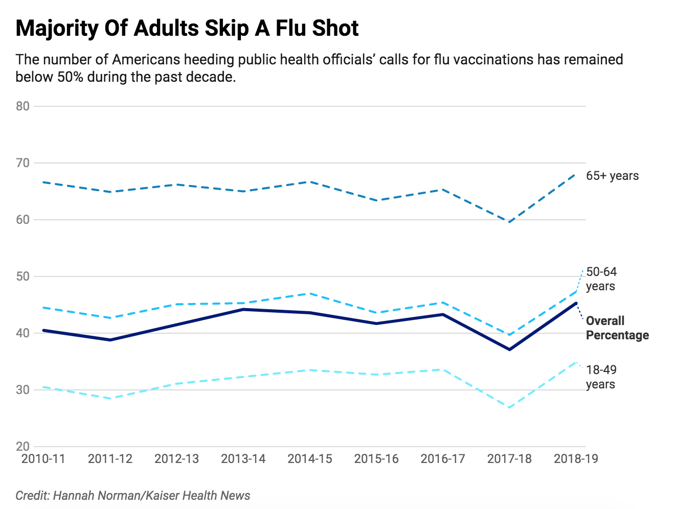 About 45% of adults received the flu shot last year, up from about 41% in 2010, according to CDC data. Immunization rates have stayed in the 40% to 45% range for the past decade. Among people 65 and older, who are most at risk for complication of the flu, 68% were inoculated last year, up from 67% in 2010.