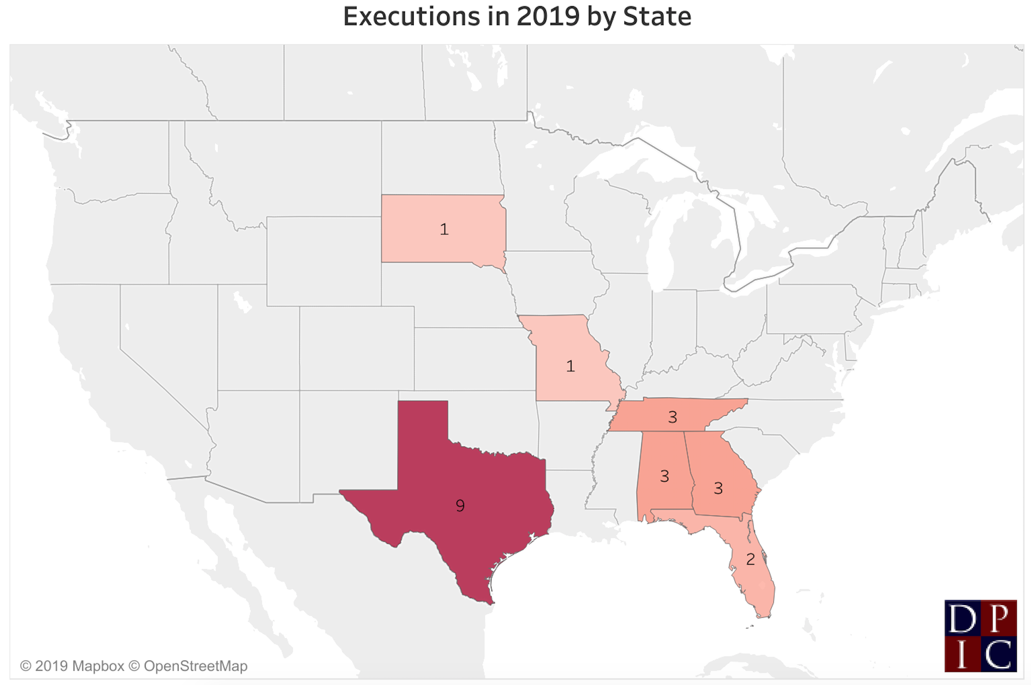 Seven states executed 22 inmates this year—the second fewest number of executions in 28 years, according to the Death Penalty Information Center’s annual report on use of capital punishment. That’s down from 25 executions carried out in eight states in 2018.