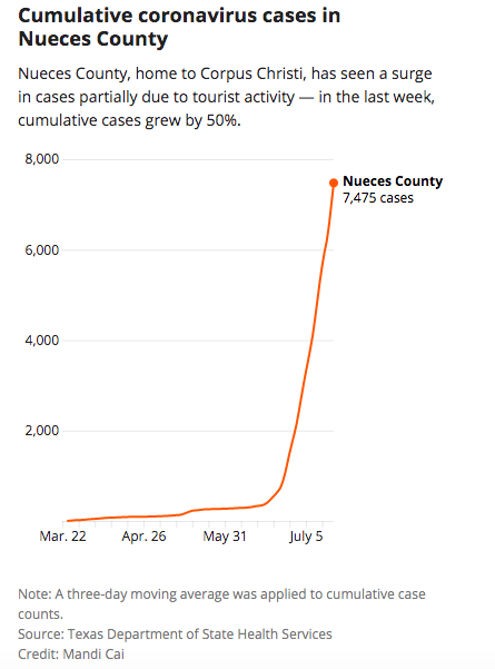 With 2% of the population infected, or one in every 50 people, Corpus Christi’s county has more cases per capita than Harris or Dallas counties. Visitors and tourists were the main drivers of the initial outbreak, local officials say, though researchers say it remains unknown why its case counts are higher than those of other busy beachfront destinations.