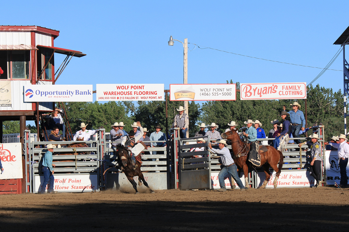 The tension over what the rodeo might bring besides a much-needed economic boost was evident in downtown Wolf Point. Several businesses taped the stampede’s schedule to their windows, while at least one shut down as a precaution. A bar hung a banner welcoming rodeo fans, while another next door closed early each night to avoid post-rodeo crowds.