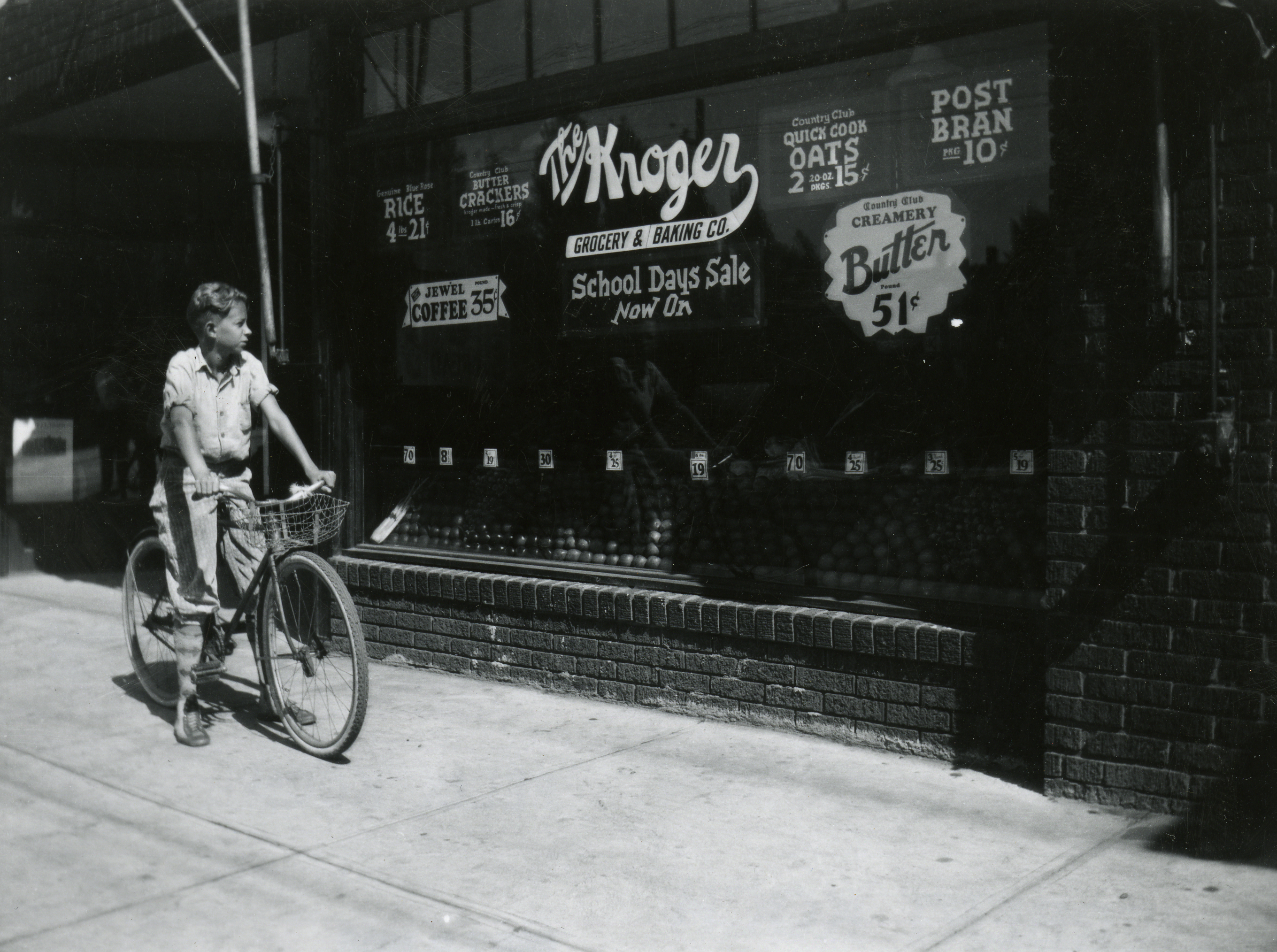 A boy on a bicycle stops to look at the window of Kroger's grocery store which advertises a back to school sale, College Hill, Ohio, 1928. Felix Koch/Cincinnati Museum Center via Getty Images