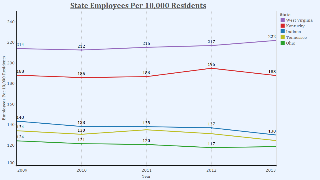 The only state among the group that consistently had more employees per 10,000 residents was West Virginia, where the number was 222 in 2013. For the other three states the figure was between 118 and 130 during that year.