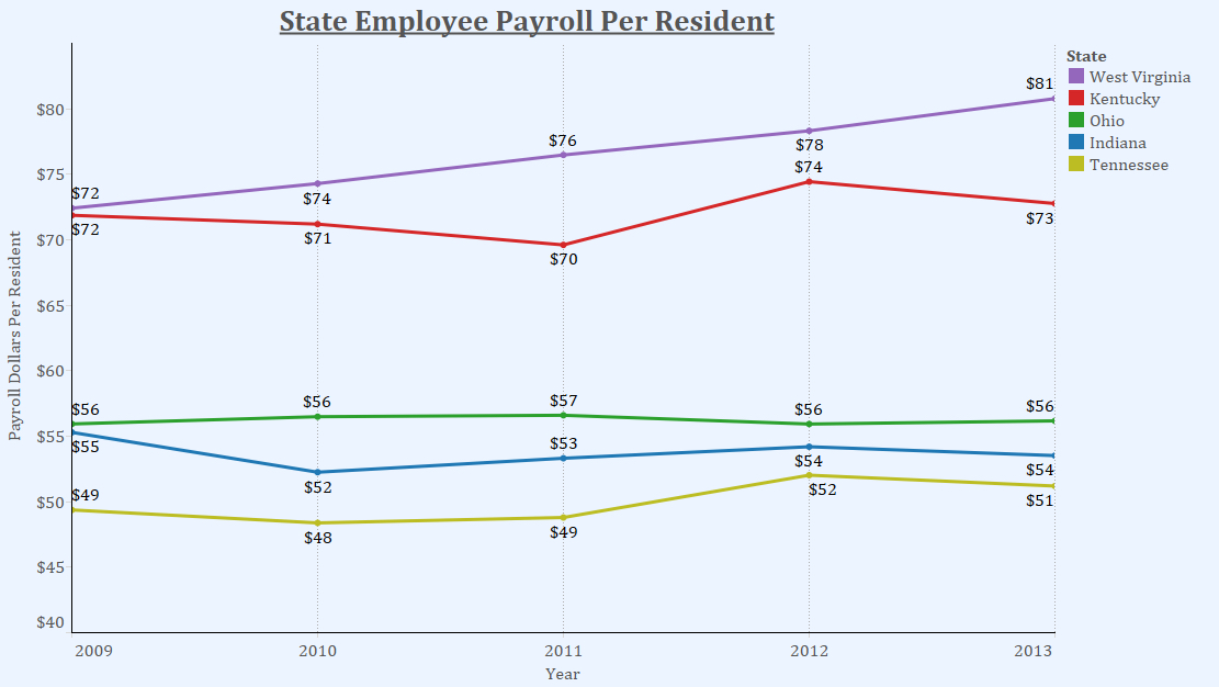 During March 2013, state payroll costs worked out to about $73 per resident in Kentucky. For West Virginia they checked in at $81. In contrast, the per-resident payroll costs in surrounding states were between $51 and $56.