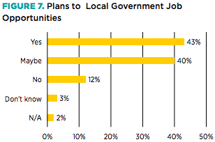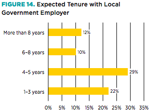 Less encouraging is the survey’s finding that more than half of students plan to stay in local government for 5 years or less, compared to the employee average of 7.1 years between 2000 and 2014.