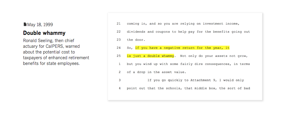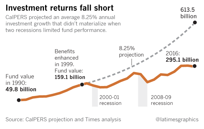 The law took effect in 2000, and that same year CalPERS investments were hammered by the bursting of the dot.com bubble. Eight years later, the housing market collapsed and the Great Recession set in, putting the pension fund in a deep hole.
