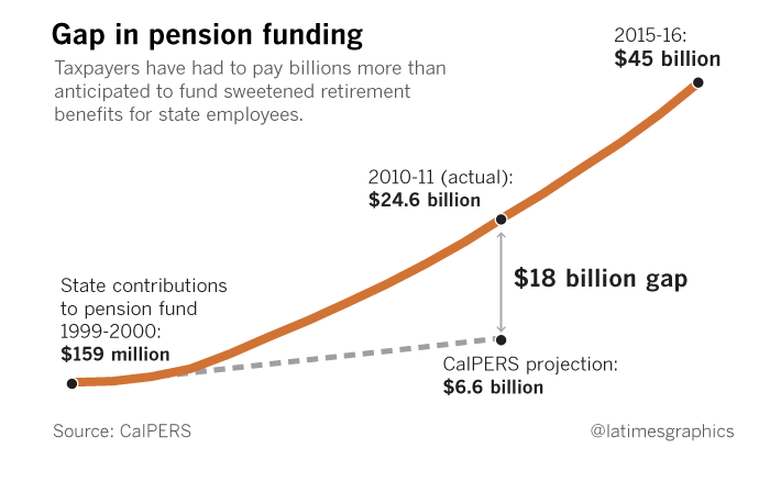 CalPERS had projected in 1999 that the improved benefits would cause no increase in the state’s annual pension contributions over the next 11 years. In fact, the state had to raise its payments by a total of $18 billion over that period to fill the gap, according to an analysis of CalPERS data.