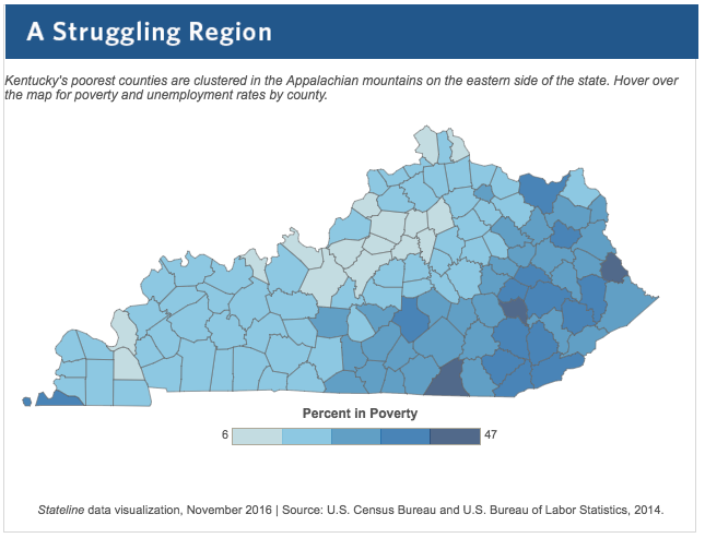 Today about 9 percent of eastern Kentuckians are out of work. Thirty percent live in poverty, according to the most recent federal statistics. Rates of drug overdose deaths, cancer, diabetes and disability are high.