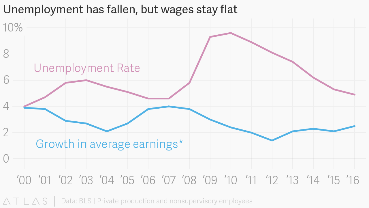 The U.S. unemployment rate is at its lowest in years. Jobs are plentiful, and Americans are quitting like it’s 2006. This is good news for employees—less so for major retailers. In theory, bountiful jobs means pressure on employers to boost wages so they can find and keep talent. But in reality, American wages have barely risen in almost a decade.