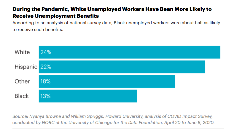 Yet despite the expansion of eligibility, a smaller percentage of unemployed Black workers are receiving unemployment benefits than white workers during the pandemic, according to national survey data from NORC at the University of Chicago: 13% of jobless Black workers received such payments between April and June, compared with 22% for Hispanic workers and 24% for white workers.