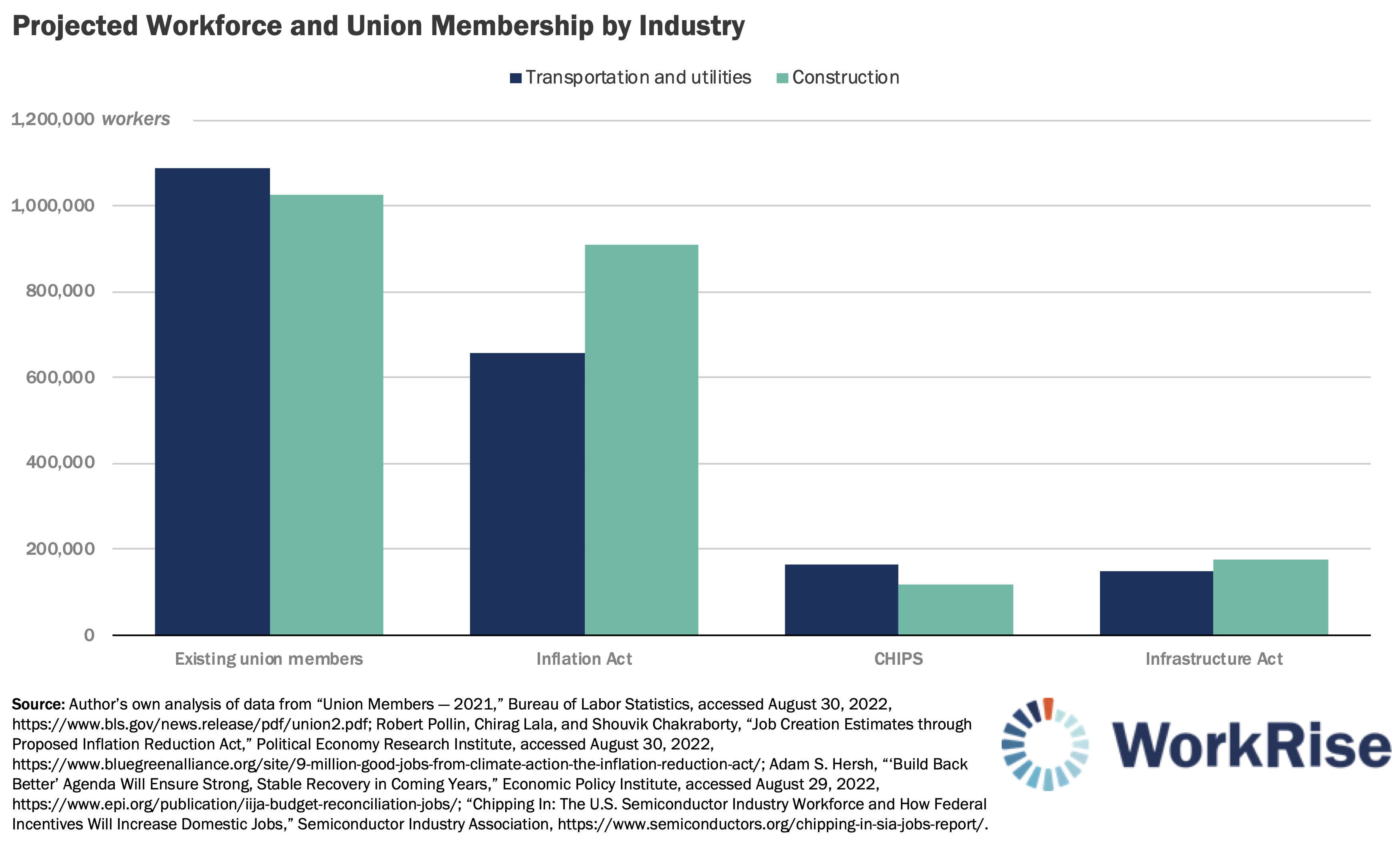 In the transportation and utilities industry—one of the most unionized in the US—the infrastructure law and IRA could encourage 150,000 and 658,000 jobs respectively over the next 10 years, while CHIPS could incentivize 165,000 jobs in the next 5 years. If unionization rates remain the same, these three laws could help fund around 300,000 new union jobs in construction, transportation, and utilities.